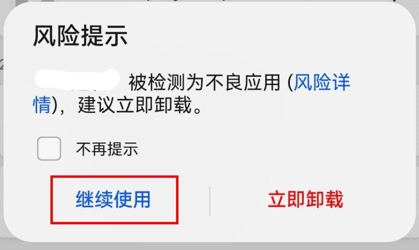 当应用出现以下风险提示时,请勾选不再提示,选择继续使用