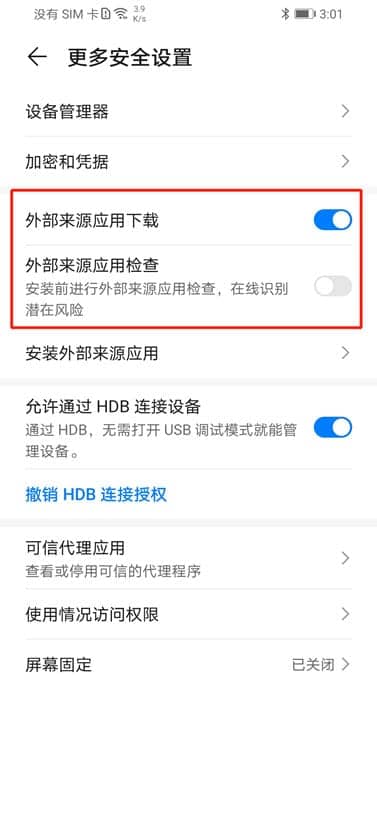 2.开启"外部来源应用下载",关闭"外部来源应用检查"